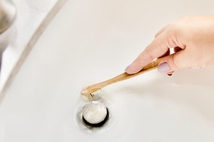 Simply apply the paste to your sink, let it sit for a few minutes, then scrub it with an old toothbrush. Afterward, give your sink a good rinse and polish the fixtures with a microfiber cloth.